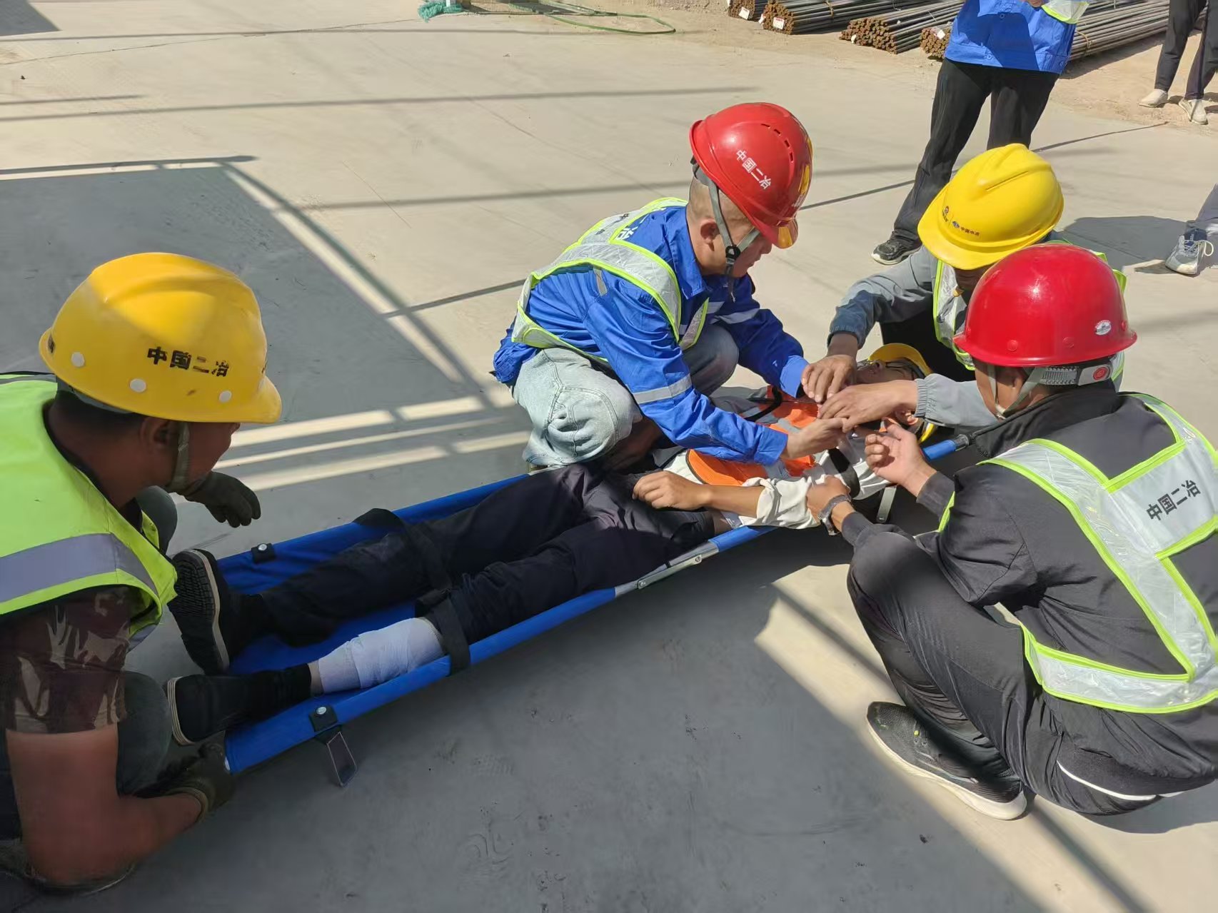 本次演練通過模擬真實(shí)場(chǎng)景,演練前安全員對(duì)整個(gè)流程進(jìn)行敘述,明確各人員職責(zé)。通過模擬鋼筋工在使用鋼筋機(jī)具時(shí),作業(yè)人員被鋼筋切斷機(jī)傷到腿部,班組長(zhǎng)發(fā)現(xiàn)情況后立即向上報(bào)告,項(xiàng)目部即刻啟動(dòng)應(yīng)急預(yù)案,第一時(shí)間查看傷員情況,對(duì)傷員腿部做消毒、包扎處理,隨即抬上擔(dān)架,送往最近的救援醫(yī)院。整個(gè)演練過程井然有序,達(dá)到了演練預(yù)期的目的。