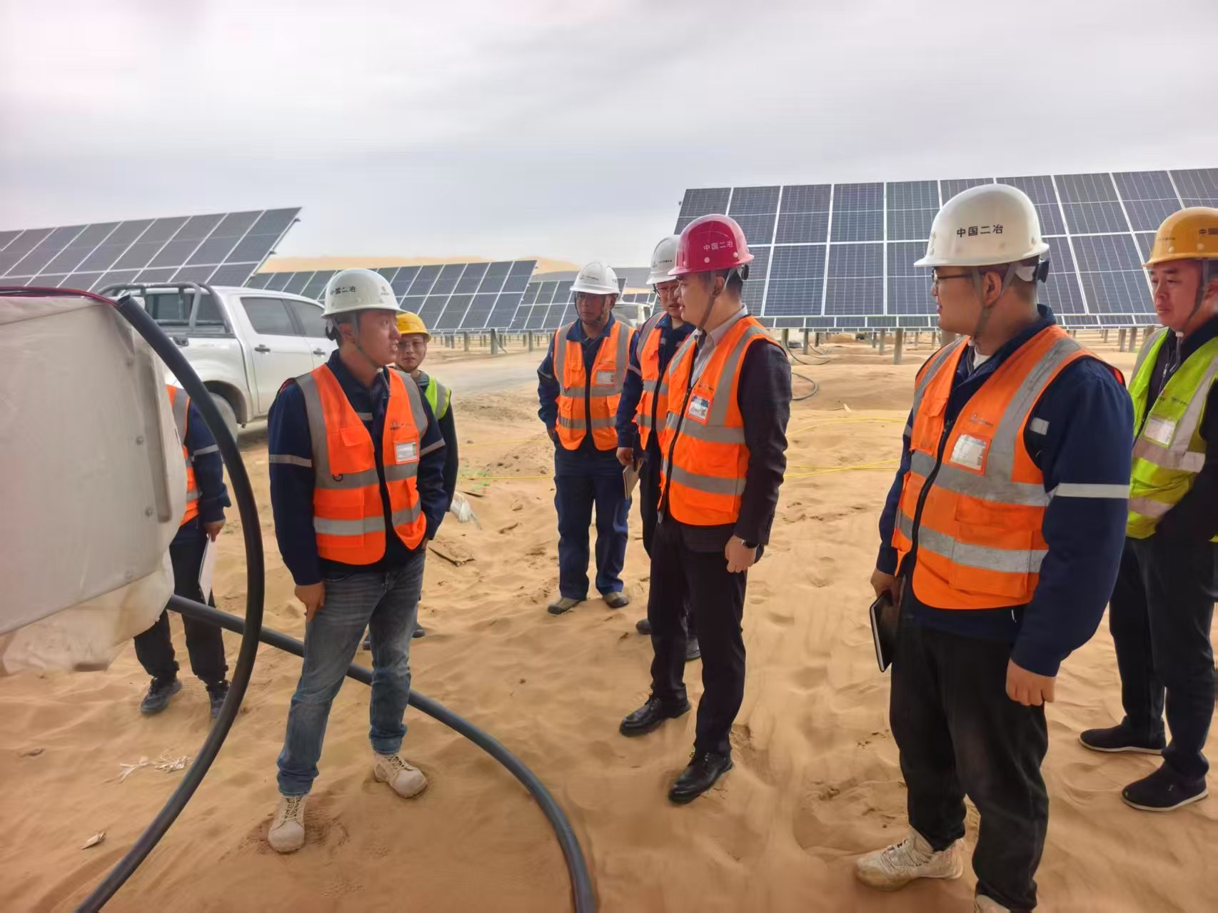 米宏達(dá)深入各子陣查看光伏組件的安裝質(zhì)量和布局情況,確保光伏組件的安裝符合標(biāo)準(zhǔn),以提高發(fā)電效率。同時(shí),針對(duì)項(xiàng)目建設(shè)核心需求,米宏達(dá)提出三點(diǎn)要求,一是安全管理上,需針對(duì)沙漠施工風(fēng)沙、高溫等風(fēng)險(xiǎn),加強(qiáng)人員安全教育培訓(xùn)與現(xiàn)場(chǎng)管控,增設(shè)警示標(biāo)志、配齊防護(hù)設(shè)備,守住安全生命線;二是質(zhì)量把控上,堅(jiān)持“質(zhì)量第一”,從設(shè)備采購(gòu)到安裝調(diào)試全環(huán)節(jié)嚴(yán)把關(guān),建立問(wèn)題臺(tái)賬實(shí)行閉環(huán)管理,打造高標(biāo)準(zhǔn)工程;三是進(jìn)度推進(jìn)上,圍繞2025年11月15日并網(wǎng)目標(biāo),制定詳細(xì)施工計(jì)劃,加強(qiáng)多部門(mén)協(xié)調(diào),快速解決建設(shè)難題,確保按期完工。?
