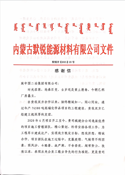 4月19日,內蒙古默銳能源材料有限公司向中國二冶發來感謝信,對在合作過程中所見證的中國二冶作為央企的實力擔當,以及用實際行動踐行的“一天也不耽誤,一天也不懈怠”的企業精神給予高度贊揚;對城建分公司領導給予該工程的高度重視、大力支持表示衷心感謝;對承擔該工程建設任務的達旗項目部全體工作人員以優秀的專業素質和過硬的技術水平,保證項目的順利進行給予充分肯定和高度贊揚。