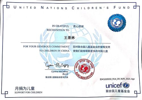 6月9日,聯(lián)合國兒童基金會致謝中國二冶優(yōu)秀青年員工王景林,對其多年來堅持向聯(lián)合國兒童基金會捐款表示衷心感謝。