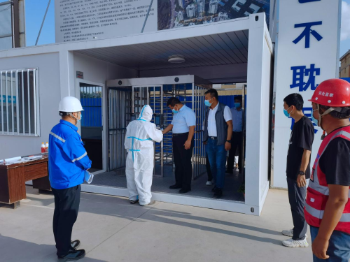 劉海泉一行首先深入施工現場,對進場務工人員來源地、供貨商貨源地等一些項目基本概況進行了解,并對現場體溫測量登記臺賬、外來人員進場登記臺賬、現場行程碼和健康碼設置情況、施工現場作業人員口罩佩戴情況,以及辦公區每日消殺記錄進行詳細檢查。隨后,劉海泉一行來到項目隔離區,仔細檢查了現場隔離室設置情況,并叮囑項目部管理人員,隔離間的配備要符合要求,確保安全可靠。