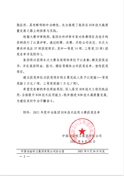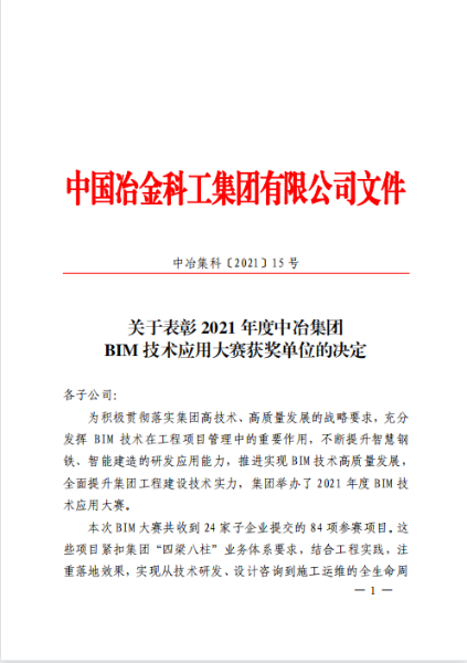 8月26日,中冶集團(tuán)〔2021〕5號文件《關(guān)于表彰2021年度中冶集團(tuán)BIM技術(shù)應(yīng)用大賽獲獎(jiǎng)單位的決定》揭曉獲獎(jiǎng)名單,中國二冶包頭市實(shí)訓(xùn)基地項(xiàng)目《包頭高技能人才公共實(shí)訓(xùn)基地項(xiàng)目BIM技術(shù)應(yīng)用》在本次大賽中榮獲“2021年度中冶集團(tuán)BIM技術(shù)應(yīng)用大賽二等獎(jiǎng)”。