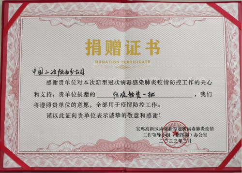 4月28日,中國二冶陜西分公司收到寶雞市高新區管委會捐贈證書,對中國二冶在寶雞市疫情防控關鍵階段提供的大力支持表示由衷的感謝。