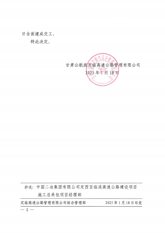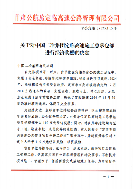 獎勵決定指出:自定臨項目開工以來,中國二冶集團項目管理團隊克服了資金緊張、疫情管控等諸多困難,積極推進項目建設(shè)。2024年,能夠積極響應(yīng)省委省政府、定西市委市政府確定的12月20日主線通車的號召,克服困難、迎難而上、精心組織,加班加點完成了通車前準備工作,確保了定臨高速在2024年12月20日準時順利通車,體現(xiàn)了央企擔(dān)當。