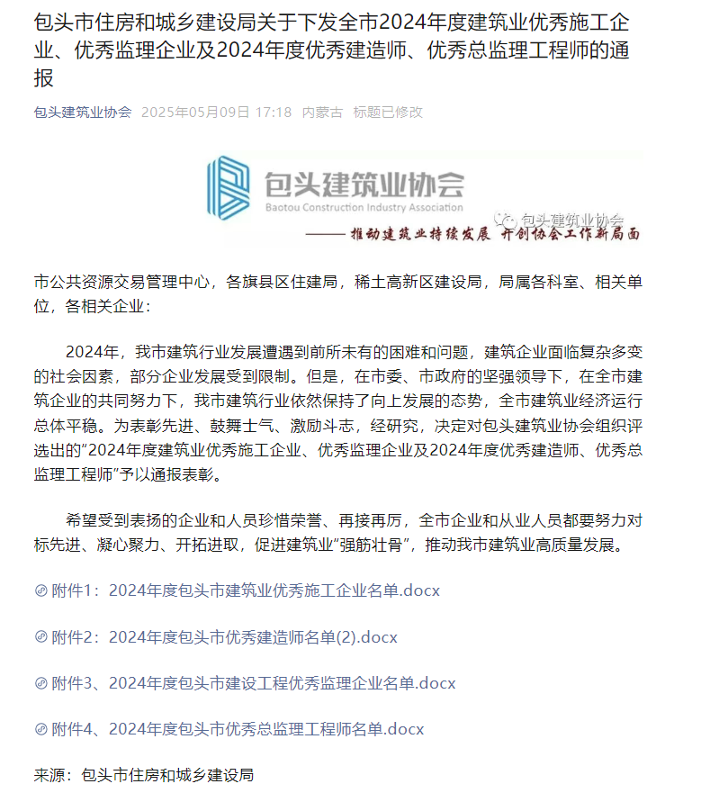 近日,包頭市住房和城鄉(xiāng)建設(shè)局通報表彰了全市2024年度建筑業(yè)優(yōu)秀施工企業(yè)、優(yōu)秀監(jiān)理企業(yè)及2024年度優(yōu)秀建造師、優(yōu)秀總監(jiān)理工程師。中國二冶獲評“2024年度包頭市建筑業(yè)優(yōu)秀施工企業(yè)”,同時30名職工獲評2024年度包頭市優(yōu)秀建造師,為公司榮譽榜再添佳績。
